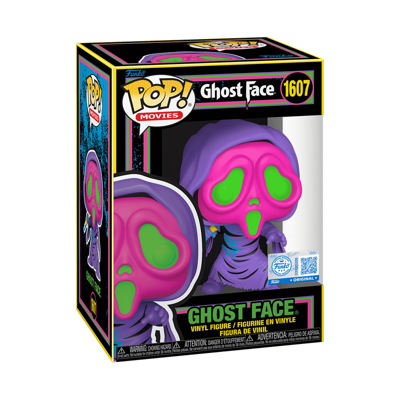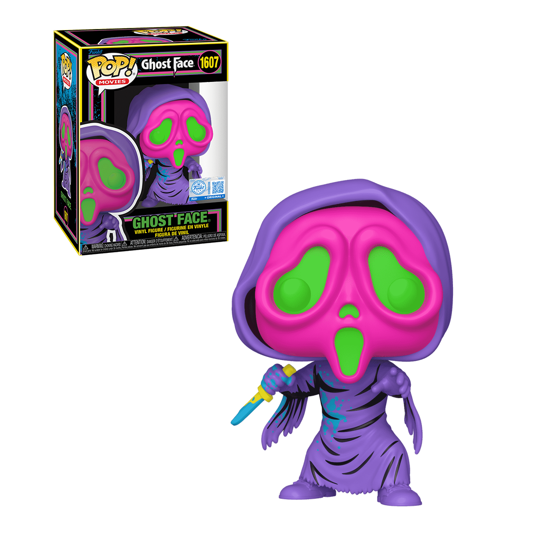 Com a faca em mãos e o manto estilizado em tons brilhantes, este POP! traz um estilo totalmente diferente do Ghost Face tradicional, combinando terror com estética retrô. Uma peça obrigatória para fãs de Scream, colecionadores de Black Light e quem ama versões exclusivas e chamativas.